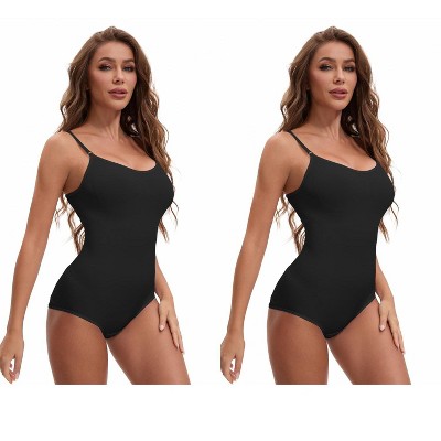 INSPIRE CHIC Women's Long Sleeves Shapewear Tummy Control Front Zipper Ribbed Leotard Jumpsuit 2 Packs 2 Black Medium