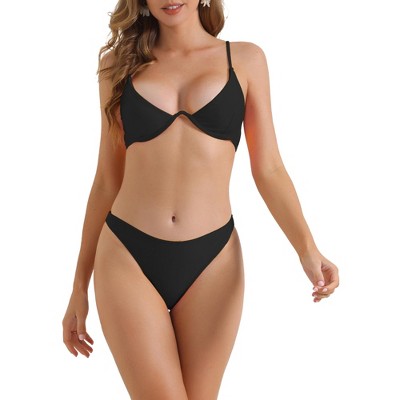 INSPIRE CHIC Women's Metal Ring Bandeau Bikini Sets Tie Side Bathing Suit High Cut Swimsuit Swimwear 2 Pieces Black X-Small