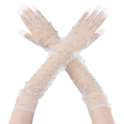 INSPIRE CHIC Women's Pearl Floral Lace Female Polka Point Finger Length Arm Sleeves Gloves 1 Pair White1