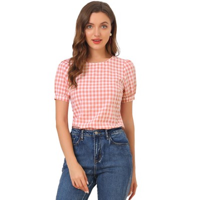 INSPIRE CHIC Women's Peasant Round Neck Ruffles Puff Sleeve Gingham Plaid Blouse Large Pink