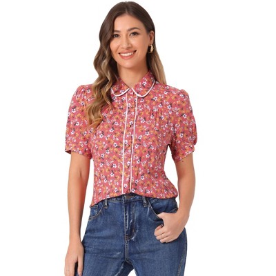 This blouse features a beautiful floral print that adds a touch of vintage charm to your wardrobe. The design includes a classic peter pan collar and a flattering V neck, making it suitable for various occasions. The puff short sleeves provide a stylish silhouette, while the smocked front adds texture and interest. The ruffled cuffs enhance the feminine appeal of this top. Made from lightweight polyester, it ensures comfort throughout the day. This blouse is perfect for spring and autumn wear, making it a versatile addition to your collection. Pair it effortlessly with jeans, skirts, or shorts for a chic and casual look. Whether you're heading to the office, going on a date, or enjoying a day out, this floral blouse will keep you looking stylish and feeling confident.