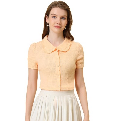 INSPIRE CHIC Women's Peter Pan Collar Smocked Puff Short Sleeve Ruffle Floral Blouse Orange Blue X-Small