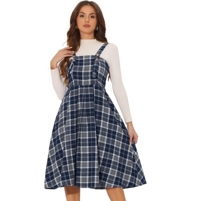 INSPIRE CHIC Women's Plaid Sleeveless Tie Back A-Line Overall Pinafore Dresses Navy Blue Green Medium