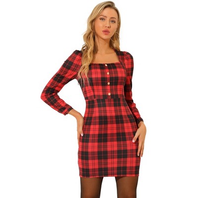 INSPIRE CHIC Women's Plaid Square Neck Pockets High Waist 3/4 Sleeve A-Line Dress - 1 of 4