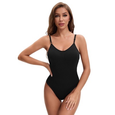 INSPIRE CHIC Women's Plunge Padded Tummy Control Slimming Waist Spaghetti Straps Seamless Soft Bodysuits Small Black