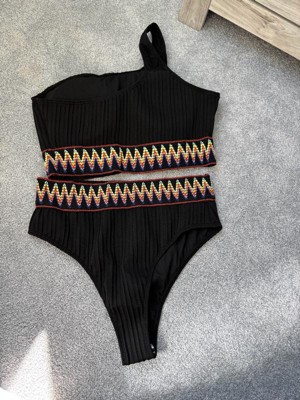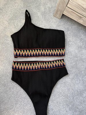 Feature: 2 pieces, solid color, color braided trim, ribbed fabric, one shoulder asymmetric strappy, removable padded cups, no steel ring, high cut triangle bottom, stretchy fabric, quick dry