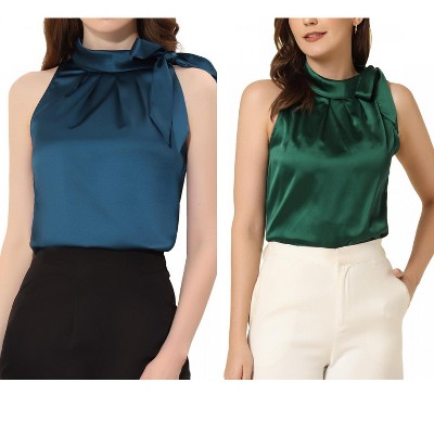 Keep your look casual and elegant in summer weather with this basic satin tops, featuring shiny rhinestone decor chain neck, round neck with keyhole design, short cap sleeve, pleated front, satin fabric, lightweight, button closure back. Pair with delicate earrings and wide leg pants for a chic casual look. Comfortable and classic, this shiny chain neck blouse is perfect on its own or as a layer under a blazer or jacket. Focused on Ladies' Semi-Formal Wear, this elegant shirt dress can be a perfect addition to almost any outfit from formal to daily wear, great for work, meeting, office, businesses, work, party, cocktail, wedding, casual, daily dressing, etc.