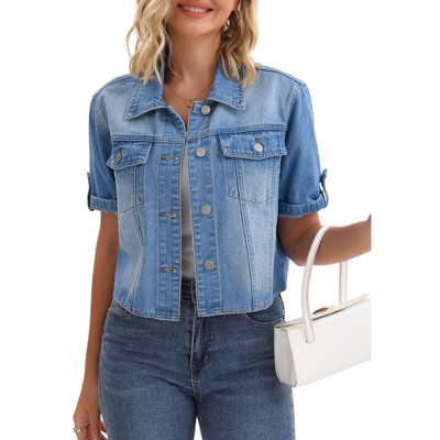 This stylish denim jacket for women is a must-have cropped jean jacket designed as a versatile denim shrug that effortlessly elevates any casual outfit. Classic jean jacket women love is a short sleeve denim jacket featuring a comfortable cropped length and convenient pockets for a trendy practical look. Experience the perfect fit with this short jean jacket women cropped a denim short sleeve jacket that combines the timeless appeal of a button-down design with modern fashion-forward. Designed for style and comfort this jean jacket for women trendy is a cropped jean jacket that works beautifully as a denim cardigan ideal for layering in any season. This short sleeve denim jacket offers a flattering cropped silhouette making it an essential denim jacket for women who appreciate a classic yet contemporary wardrobe staple.