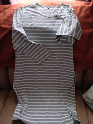 Crafted from 95% cotton and 5% spandex, this soft nightgown features a comfortable round neckline and contrasting stripe pattern. With its practical 3/4 sleeves and thigh-length cut, it provides ideal comfort for sleeping, lounging at home, or relaxing during travel.Garment Care: Machine wash cold, tumble dry on low heat. Do not bleach. Model size: Height: 5'8", Waist: 25", Bust: 32", Hip:36", Weight: 125 lb, S in nightwear.
