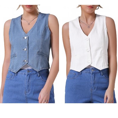 INSPIRE CHIC Women's Sleeveless Turndown Collar Button Down Chest Flap Pockets Washed Denim Vest 2 Packs White/Dark Blue X-Large