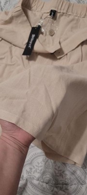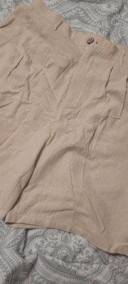 Features: High waist, elastic back, wide leg, folds on the front, two pockets, linen fabric, knee length, zipper