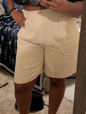 These Bermuda shorts are designed for women who appreciate style and comfort. Made from a blend of 80% Rayon and 20% Linen, they offer a soft touch and are gentle on the skin. The high waisted design with an elastic back provides a flattering fit, while the wide leg and front folds add a fashionable touch. The shorts feature two pockets and a convenient zipper, making them practical for daily wear. Suitable for various occasions, these shorts can be paired with a variety of tops and shoes, making them a versatile addition to any wardrobe. Perfect for spring, summer, and fall, they are ideal for casual outings, office wear, or even a day at the beach.