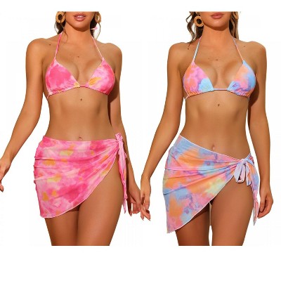 INSPIRE CHIC Women's Tie Dye Halter Tie Back Triangle Bottom Cover Up Skirt Swimwear Bikini 2 Sets - 1 of 4