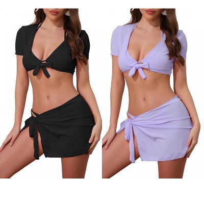 INSPIRE CHIC Women's Tie Knot Halter Ribbed Short Sleeve Cover Up Set Triangle Bottom Swimwear Bathing Bikini Suits 2 Sets Small Black, Light Violet