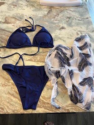 INSPIRE CHIC Women's Triangle Halter Bikini Sets High Cut Thong Leaf Print Cover Up Skirt Swimwear Bathing Suits 3 Pieces Dark Blue Medium