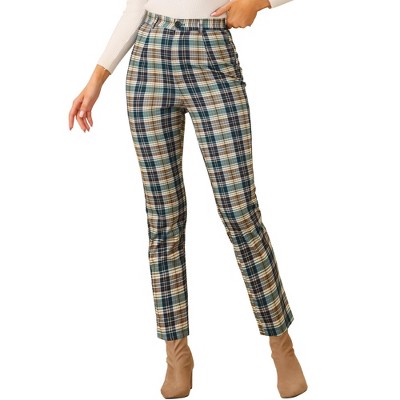 INSPIRE CHIC Women's Vintage Tartan Plaid Elastic Waist Straight Long Trousers Pants Small Light Green