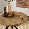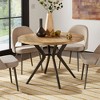 With a mid-century feel, the iNSPIRE Q Presley Wood Finish and Iron Gray Metal Base 4-person Round Dining Table pairs perfectly in simple and contemporary settings. The pine wood finish table top displays the appearance of solid wood with its natural wood grain pattern, giving your space an organic feel, while the thin, iron gray metal trestle base showcases a clean-cut, modern design.