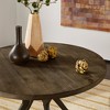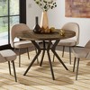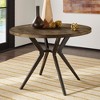 With a mid-century feel, the iNSPIRE Q Presley Wood Finish and Iron Gray Metal Base 4-person Round Dining Table pairs perfectly in simple and contemporary settings. The pine wood finish table top displays the appearance of solid wood with its natural wood grain pattern, giving your space an organic feel, while the thin, iron gray metal trestle base showcases a clean-cut, modern design.