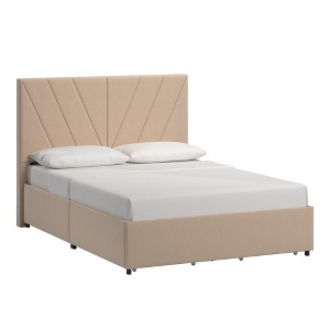 The V-Channel Headboard Storage Platform Bed is a stylish addition to any bedroom. This bed displays a channel-style headboard in a V shape for visual interest. Beige linen upholstery softens the piece yet adds sophistication. Store all your bedroom essentials in the four spacious drawers. A sturdy wooden construction will have you sleeping soundly for years to come.