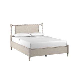 Escape to serenity every night with the Demetria Antique Finish Beaded Wood Platform Bed. Uniting contemporary and classic elements, this charming bed is constructed with wood for lasting reliability and boasts a neutral antique wood grain finish for timeless character. The rectangular headboard features lovely, beaded styling and turned legs, creating a look perfect for any modern farmhouse.
