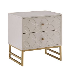 Whether placed in your living room or bedroom, this Arched Diamond Gold Metal End Table is sure to be a showstopper. Coming with two spacious drawers, you have more than enough space to stow away everyday items, while the smooth table top offers ample surface to set up a reading lamp. This luxurious end table features a gorgeous, arched diamond pattern on the drawer fronts, accented with antique bronze knobs for eye-catching visual interest. A sturdy metal base in a gold finish completes this chic piece, making it great for those who love bold style.