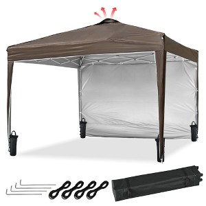 Features:- Portable - InstaHibit 10x10 ft Pop-up Canopy Tent with Sidewall comes with a foldable frame and detachable top canopy and sidewall for easy storage, along with a carrying bag with handle and pulleys for easy transportation, allowing you to bring it along with you on all your outdoor activities- Easy & Fast Installation - Features a one-piece frame for easy tool-free assembly and pinch-proof buttons on 4 legs for 3-level height adjustment, simply extending the frame, covering the cover, adjusting the tent height, then fixing the tent with ropes and ground stakes to complete installation in 10 minutes- UV50+ Protection Canopy - Constructed of silver coated oxford fabric which features UV50+ protection to block 99% harmful UV ray and water resistance of up to 800mm, allowing you to enjoy the outdoors in summertime- Stable & Comfortable - Comes with 4 sandbags, ground stakes and tie ropes for fixing the tent on the ground, along with ventilation holes on the top to improve air circulation and reduce external wind pressure against the tent for stability and comfort, creating a cozy and relaxing interior space- Wide Application - This popup tent is a perfect sunshade for you to enjoy various outdoor activities, like family gatherings, parties, beach vacations, camping, picnics, etc., and ideal for using at patio, backyard, front yard, lawn, garden and beachSpecifications:- Overall Dimension(LxWxH): 117 5/16" x 117 5/16" x 104 3/4" (298 x 298 x 266 cm / 10x10x8.7 Ft)- Folded Dimension(LxWxH): 6 11/16" x 6 11/16" x 44 7/8" (17 x 17 x 114 cm)- Adjustable Height: 70 1/2", 87 13/16", 104 3/4" (179, 223, 266 cm)- Sand Bag Size(LxW): 16 9/16" x 8" (42 x 20.3 cm)- Roller Bag Dimension(LxWxH): 8 1/4" x 8 1/4" x 45 1/4" (21 x 21 x 115 cm)- Net Weight: 30.97 Lbs (14.05 kg)Package Contents:- 1x Canopy & Frame- 1x Sidewall- 1x Roller Bag- 4x Ropes- 4x Ground Stakes- 4x Sand Bags- 1x ManualNotice: - Please do NOT stretch the legs with violence while adjusting height to protect the frame.