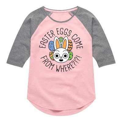 Instant Message - Easter Eggs Come From Where - Toddler & Youth Girls Raglan Graphic T-Shirt - Instant Message is an online specialty fashion retailer for everything from funny to inspiring printed apparel. We offer a range of garments from long sleeve and relaxed fit t-shirts, to lightweight french-terry long sleeve shirts, hoodies and graphic print pullovers. Our products feature fun and trendy graphics that are perfect for any occasion and also make great gifts.