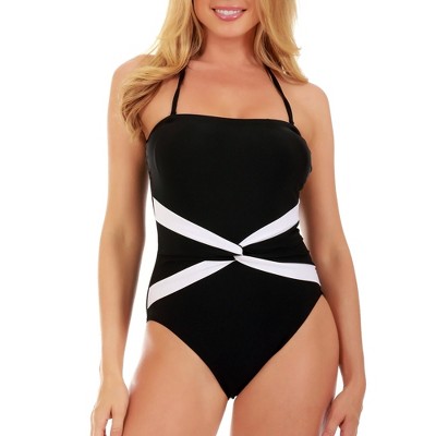 Feel confident and stylish! This elegantly designed swimsuit covers and complements your curves in all the right ways, offering subtle and effective slimming. Whether at the poolside, beach, or any swimming event, this swimsuit is sure to make you feel fabulous. Slip into this swimsuit to instantly flatten your tummy, slim your hips, and flatter your derriere Sophisticated Style Contrast trim Interlocking loops over the keyhole back Comfortable and Supportive Wide Straps Built-in shelf bra with soft foam cups Flattering Smooth and Slimming Fabric 72% nylon and 28% spandex 4-way stretch