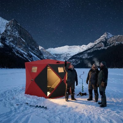 Outfit your next winter fishing adventure with this advanced ice fishing shelter. The rapid hub system allows for one-person setup in just 60 seconds, while triple-layer insulation ensures warmth in harsh conditions. With roomy interior dimensions and supportive features like all-weather durability, adjustable ventilation, and reflective safety details, it’s engineered for both group comfort and peace of mind. Portable and easy to assemble, it’s the ultimate choice for serious anglers.Specifications:Capacity: 3–4 peopleDimensions: 5.7 ft x 5.7 ft x 6.6 ftMaterial: 420D insulated fabric, fiberglass poles, metal hubsSetup Time: 60 secondsSpecial Features: Double-layer windows, vents, reflective strips, carrying bag