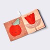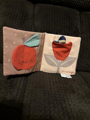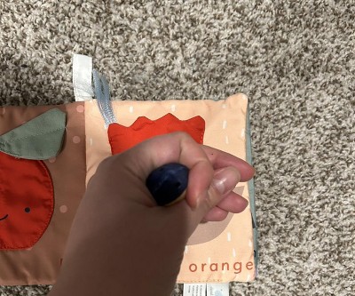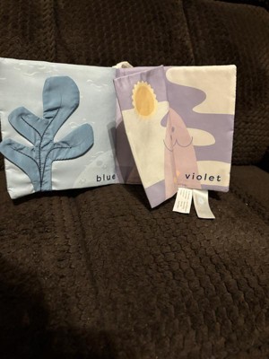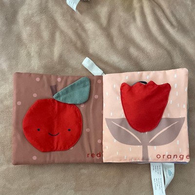 My daughter loves this interactive book, however it’s ever strange that the cloud isn’t attached. Also the “orange” flower on the orange page is actually the same red material as the apple on the ajacent page. That will be very confusing while she learns the colors. Her favorite pages are the mirror, the bee, and the flap on the violet page.