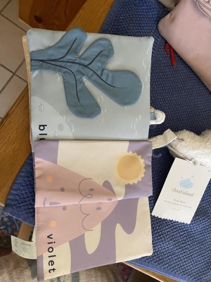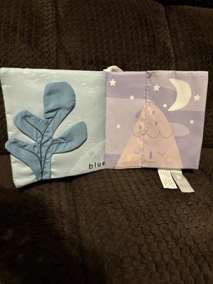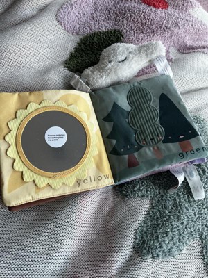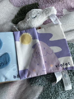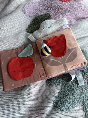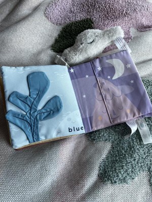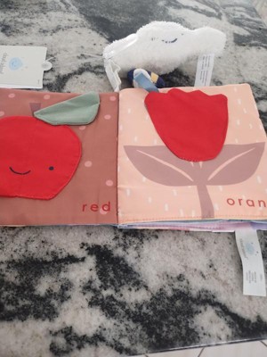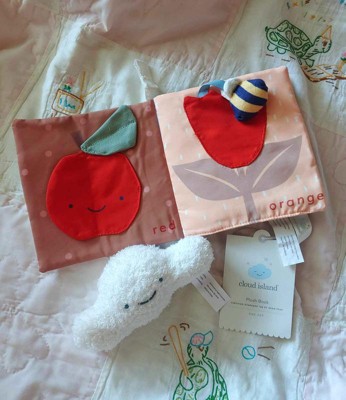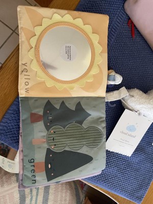 This soft book for babies and toddlers is just darling. The book is designed to stimulate a little one's desire to explore with crinkly pages, a bee to hide and find, a mirror, and other fun activities built into the soft cloth pages. There is a variety of cloth textures throughout and a fun, silky-soft stuffed cloud companion toy. The pages are all softer, muted tones that teach colors. This book would be a wonderful baby gift and would be the perfect addition to any nursery. Great choice!