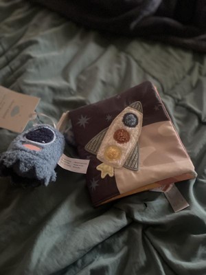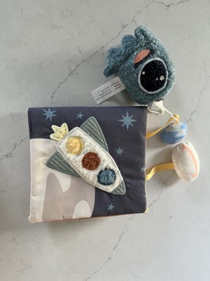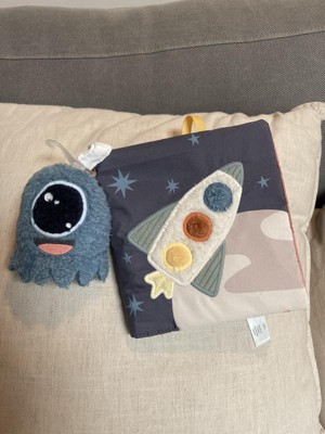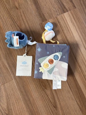 Keep your little one happy and busy with the Interactive Soft Book and Plush Toy from Cloud Island™. This space-themed soft book showcases rockets, planets, and more and includes a rocket-shaped plush toy to help keep them entertained. Made of soft fabric, it has a built-in loop for easy attachment to cribs, strollers and more.