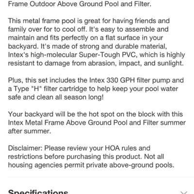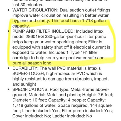 The pool itself is fine. It's an intex frame pool. We've had others. The listing says included items of a pump, a cover, a ladder and a liner to set the pool on. It includes none of that. It includes some tubing and the valves for a pump but no pump. We have an old pump in storage my husband will have to dig out but the whole reason for purchasing this listing was for the included items. Now I'll need ladder for my 10 year old to get into the pool and cover so leaves and bugs don't get into it. If we didn't already have a pump I'd have to buy that too. This listing may seem like a good deal and I've bought my sons old swingset from spreetail with no issues but this listing is false advertising. Just spend the more money and get one that actually includes everything. At least a pump and cover.