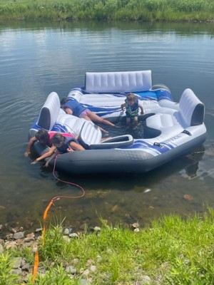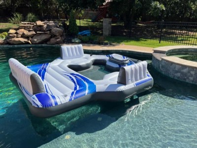 [This review was collected as part of a promotion.] I live on a lake and my family loves new water toys. This is one of their favorites. It is comfortable and sturdy for up to five people. The cooler is nice for the beverages and the cupholders are convenient. The mesh bottom is great for cooling your feet and the back rests are a must! It can be blown up quickly and deflated quickly too. It is easy to store when not in use. Overall, a must for summer water fun!