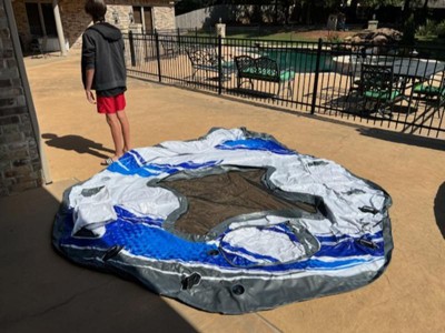 [This review was collected as part of a promotion.] This inflatable lake island water float us summer fun in a box! We have so much fun with it! We like to float around and jump off of it into the water. One of my favorite features is the mesh bottom so you can put your feet in and cool down without having to get into the water. I also love the built in coolers and the cup holders along the sides. It is very spacious with 3 different seating areas that provide plenty of room. It is very easy to blow up. It took around 10 minutes and it was ready for the water. We don't have any problems with it losing air at all. It doesn't take long to deflate either which is a big plus for me. It's very easy to fold up and can easily be stored in a big tote for transport. Overall it's very durable and sturdy and will provide lots and lots of fun! Highly recommend!