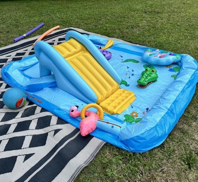 This all-in-one inflatable kiddie play center is designed for hours of fun and features a variety of exciting activities. Kids can zoom down the small water slide and land safely on the soft landing pad, splash around in the wading pool, and enjoy a refreshing spray from the Dino Arch water sprayer. The built-in Dino Hoops game offers endless tossing fun, while the Volcanic Ball Roller game—complete with 6 colorful balls—adds another layer of excitement to their summer playtime.