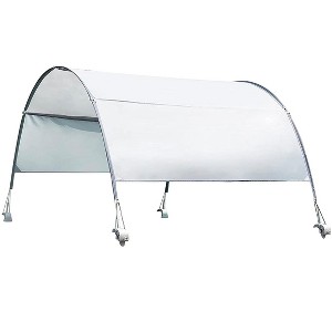 Take a break from the sun without having to leave the pool. Constructed of durable UV protected fabric, this canopy shade boasts a simple design that easily attaches to a range of above ground swimming pools. The sturdy construction withstands wind speed up to 16 3/8 FT Features: UPF 50+ Rated UV protection. Simple setup – easily attaches with clamps. Stretches over the entire width of the pool. Waterproof and wind resistant up to 11 mph. Fits 10ft and 12ft diameter round frame pools and all Prism Frame. Rectangular, Prism Frame Oval and Ultra XTR Rectangular pools (except 32ft x 16 ft x 52 and 9ft 10 in x 5ft 9in x 31 1/2in). Dimensions: 2'H X 8'L X 54"W