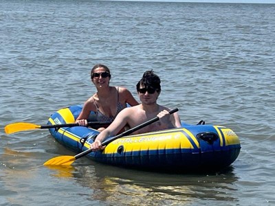 [This review was collected as part of a promotion.] This boat was so much more than I expected! It was a breeze to blow up, it came with its own pump -took about 5 minutes to fill up. My 2 adult children fit and had plenty of room. We have been using it for a solid week at Cape May and it is sturdy! Also nice that it comes with paddles so it’s easy to carry. -It is really big so I’m uncertain how we will get it back in the box to take home.