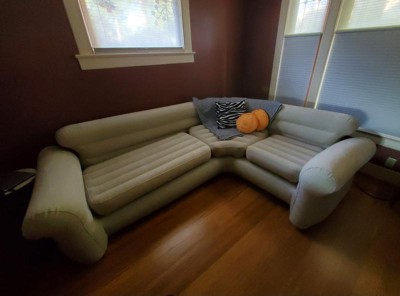 This Intex Inflatable Corner Sofa works as a great addition to any rec room, game room, dorm room, and is even ideal for camping trips. With a waterproof flocked top surface, a vinyl bottom, and a neutral color, this sectional sofa fits any decor and environment. This sectional has deep seats and wide armrests for a practical and sophisticated appeal. The 2-in-1 valve with extra-wide openings allow for fast inflation and deflation and it folds compactly for storage or travel. This sofa can hold up to 880 pounds, providing a comfortable and convenient alternative to traditional heavy furniture. With the ability to fold compactly for storage and travel, this couch is easy to transport from place to place.