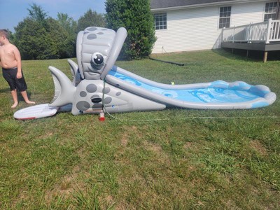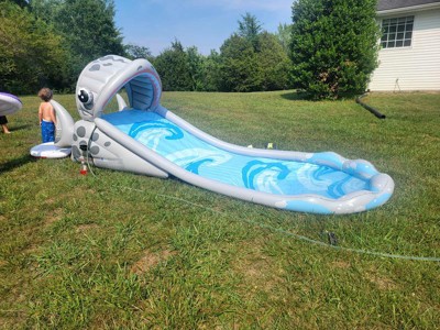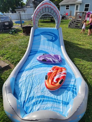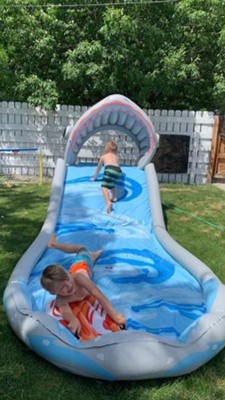 [This review was collected as part of a promotion.] Every kid loves some water fun in the summer or any hot/warm day so we were excited to try this Surf n Slide for our boys! They absolutely loved it! We had an air compressor and carefully blew it up that way and it didn't take very long. If you don't have an air compressor or pump, I don't know how you would blow it up became there is a big hole that air goes into. I wish it was a tad bigger for my bigger boys but they still had a blast on it! For reference, my boys are 11, 8 and 4. My 8 year old is almost as big as my 11 year old. Anyway, they still loved it and played on it for a few hours the first time we blew it up! Water comes out easily at the top of the slide and pools up at the bottom making a nice splash when they slide down. Towards the end, the decided to slide down without the blow up boards that came with it and still loved it. Default recommend for young kids wanting some water fun!