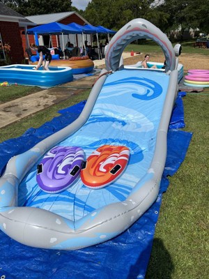[This review was collected as part of a promotion.] This is a great hot, summer activity! My two boys love this thing! I love that it has two inflatable surf riders so they don't have to fight over them or take turns. I also love the bottom is raised so it slows my little one so he doesn't slide right into the grass. Occasionally he bumps over that little edge but most of the time it stops him or slows him down enough and keeps from a giant mud puddle happening at the bottom. My suggestion is to let it run for 5 minutes or so before sliding to let it get wet enough to work well. My boys spend an hour or more on this thing whenever we pull it out. Great choice in water fun!
