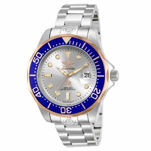Invicta 13788 Pro Diver men's dive watch features a 47mm wide solid stainless steel case with a fixed gold tone scalloped edge blue bezel and textured screw down crown. Invicta 13788 is powered by Japanese NH35A automatic movement. This stylish watch also features a shiny silver tone dial with white accents gold tone luminous hands and hour markers along with the date display function, scratch resistant mineral crystal and water resistant to 300 meters. Invicta 13788 is equipped with a 22mm wide solid stainless steel bracelet with a fold over deployant safety clasp. Invicta 13788 men's Pro Diver blue gold bezel silver dial automatic dive watch is brand new and comes in an original Invicta gift box and is backed by a 3 years manufacturer warranty.