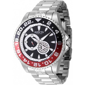 Invicta 47302 Pro Diver dive men's watch features a 47mm wide and 17mm thick silver tone solid stainless steel case with a white accented black and red unidirectional rotating bezel and textured screw-down crown. Invicta 47302 is powered by a precise Japanese Miyota 8247-43A automatic movement with 21 jewels. This stylish watch also features a textured black dial with white accents silver tone luminous hands and index hour markers 12/24-hour time display function, scratch resistant mineral crystal and water resistant to 300 meters. Invicta 47302 is equipped with a 22mm wide silver tone solid stainless steel bracelet with a fold over safety lock clasp. Invicta 47302 men's Pro Diver red and black bezel automatic watch is brand new and comes in an original gift box and is backed by a 3 years limited warranty.