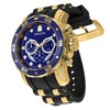 Invicta 6983 Men's watch features polished finish gold plated stainless steel case with unidirectional rotating bezel. This great watch also comes with high quality Chinese quartz movement, scratch resistant mineral crystal, water resistant up to 100 meters, black polyurethane rubber strap with gold plated stainless steel inserts and blue sunray dial with chronograph function, date display, luminous hands and hour markers.