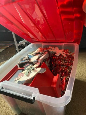 The IRIS 20.5 quart storage containers are versatilely designed to accommodate a wide range of decorations, including ornaments and lights. Featuring secure buckles that create a tight seal, these boxes safeguard contents from damage and dust, ensuring they remain in pristine condition for the next holiday season. The distinctive red color makes them easily recognizable among other bins and containers. Proudly made in the USA, this set includes 4 containers.