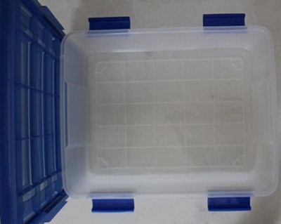 [This review was collected as part of a promotion.] This is such a nice storage bin! I feel secure enough using this for the pictures of my kids, that's how much I trust this product. I love the blue color on the lid, I love that everything is see through so I can check on my stuff inside. There are four locks so I know what's inside isn't coming out. It is smooth and clean inside. Easy to hold, easy to store. It's everything you want in a storage bin.