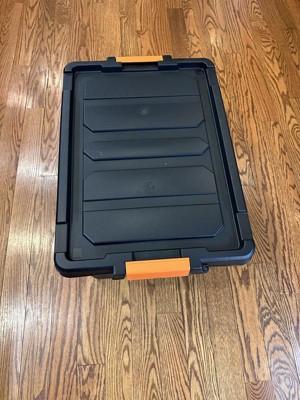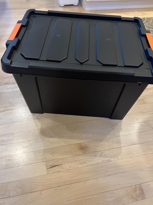[This review was collected as part of a promotion.] I received the IRIS 78qt Store-it-all Tote. The tote is 19 gallons. Color is black with orange handles. The orange is a nice pop of color most containers do not have. I love that the inside is open with hardly any ridges and the container is fairly deep. You can fit a lot in this container. The container bottom is ok but i wish it was a bit stronger material. The lid is very well made and thick. The side handles latch on tight but are easy to open or close. The stackable design is excellent especially If you have more than one container. These containers work great to store what ever you may need. Highly recommend.