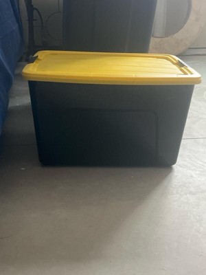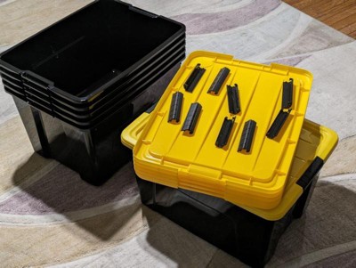 [This review was collected as part of a promotion.] These storage bins really came in handy recently when we did some organizing in our home. They are a good size and can hold quite a lot of things. They are sturdy and easy to carry. Best part is how they stack nicely on top of each other. I think they look pretty good too. It is nice they have a yellow cover, they are easy to see in a dark basement where we are keeping them.