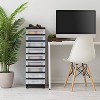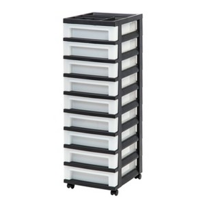 The IRIS 9 drawer storage cart with organizer top can help you get organized in no time. This drawer organizer features 9 drawers that hold everything from craft supplies to reams of paper, so your space stays tidy. The built-in divided organizer top has 6 separate compartments ideal for pens, notebooks, mail or anything else you need to keep in one place. The drawers accommodate 8.5" x 11" letter size paper and a variety of home and office essentials. This storage tower also features smooth casters making this a versatile cart drawer storage system perfect for the office, workstations, bathrooms, bedrooms, laundry rooms, hobby rooms, dorms, and more.