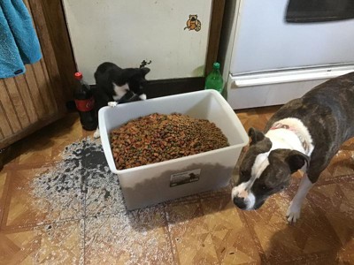 [This review was collected as part of a promotion.] I like the plastic on this container. It’s more durable than most of the containers that you purchased a store dog or cat food. The lid snaps on nice and snug and I like the fact that it is chess level on those small dogs in case you wanna use it for that purpose to put food or water in there. My great Pyrenees would tear this apart so I don’t leave them with this. It really is a container that would feel more of medium size dogs with a purpose that were using it for now to store food for our cats. Go to heavy duty plastic container I couldn’t see this they are stacked up against the wall in the garage with several other of the same containers to feed multiple pets. Overall good container.